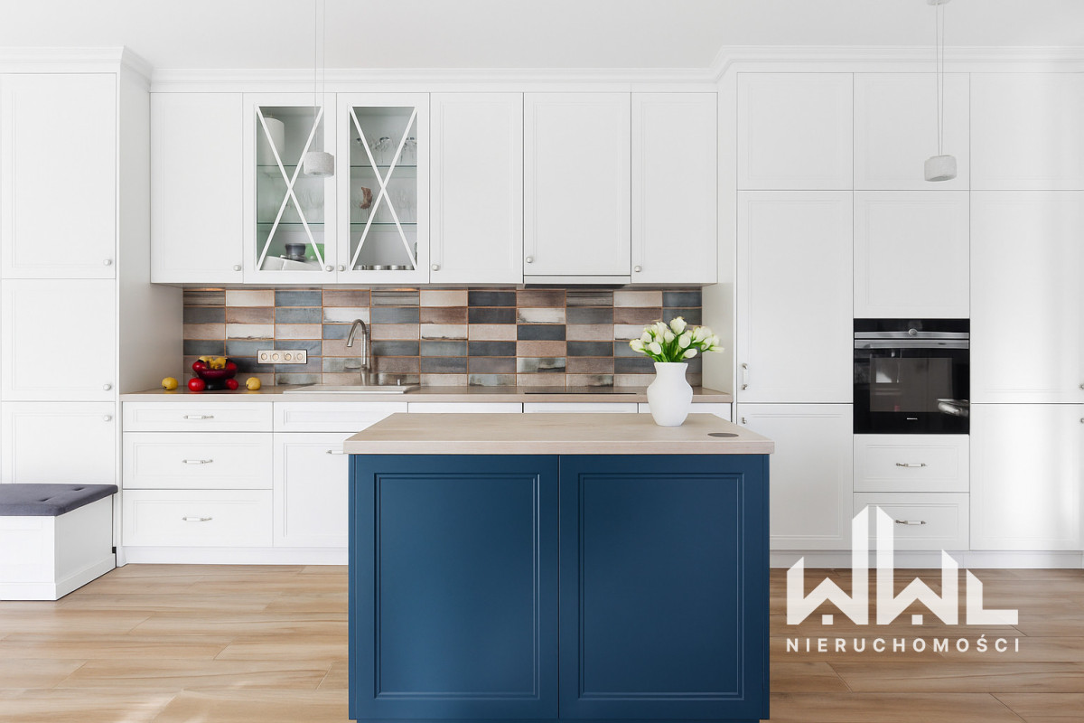 Wyspa kuchenna z dębowym blatem, wysokiej klasy sprzęt AGD w zabudowie oraz subtelne oświetlenie nadają kuchni lekkości i luksusowego charakteru.