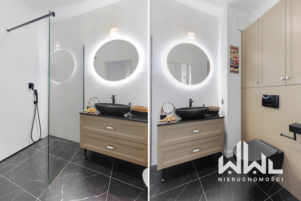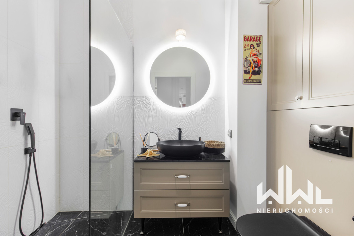 Łazienka to oaza relaksu - prysznic, designerska armatura, eleganckie czarne akcenty i nastrojowe oświetlenie tworzą klimat prywatnego spa.